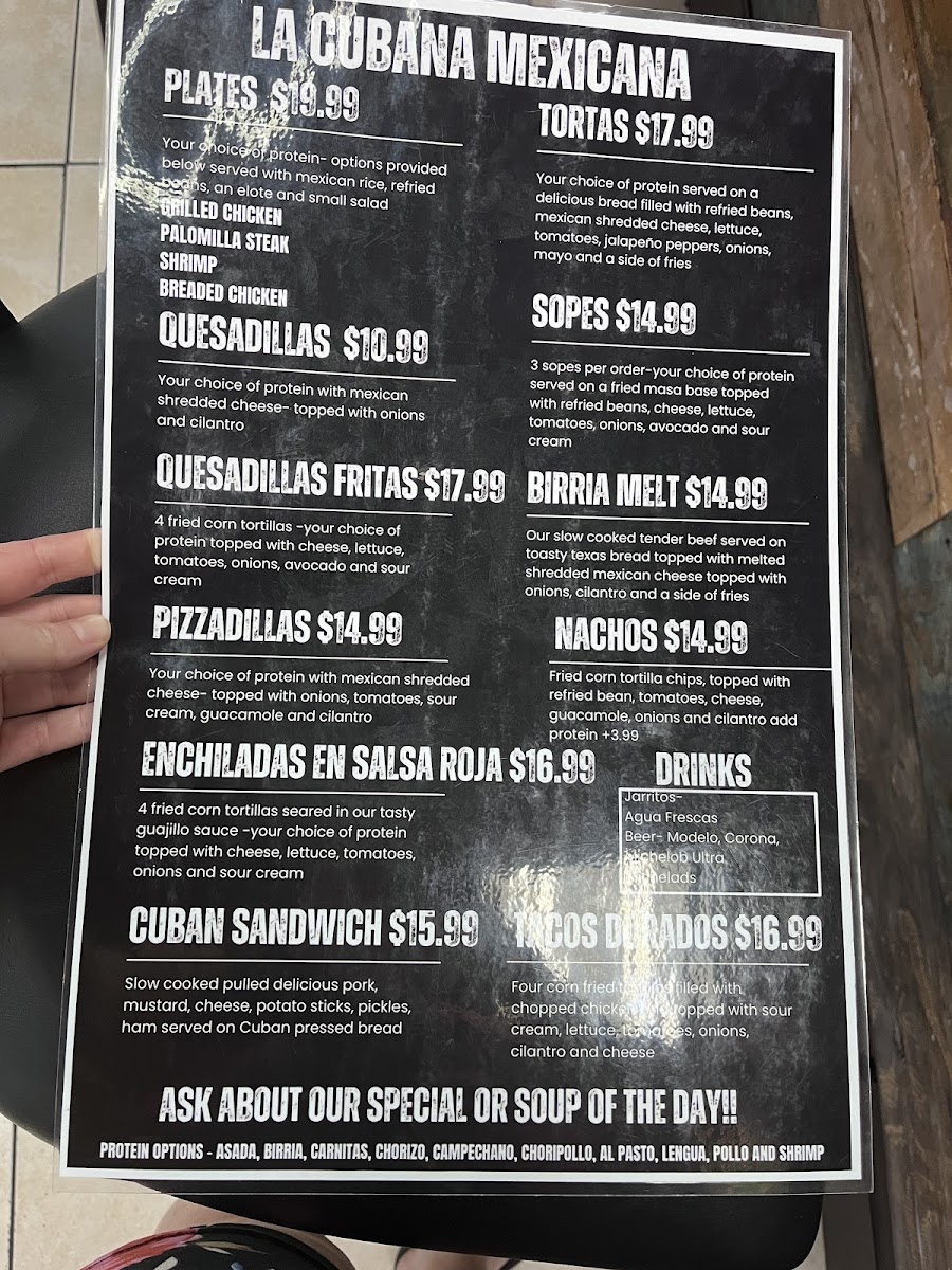4 fried corn tortillas -your choice of protein topped with cheese, lettuce, tomatoes, onions, avocado and sour cream.