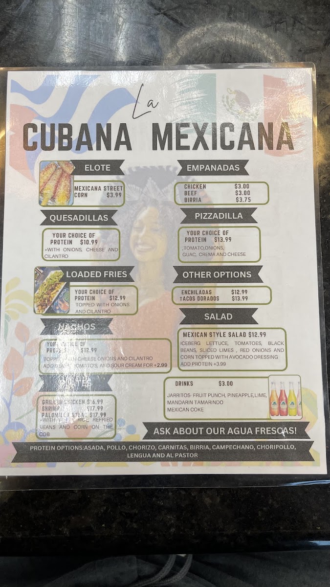 Served with mexican rice, refried beans, an elote and small salad.